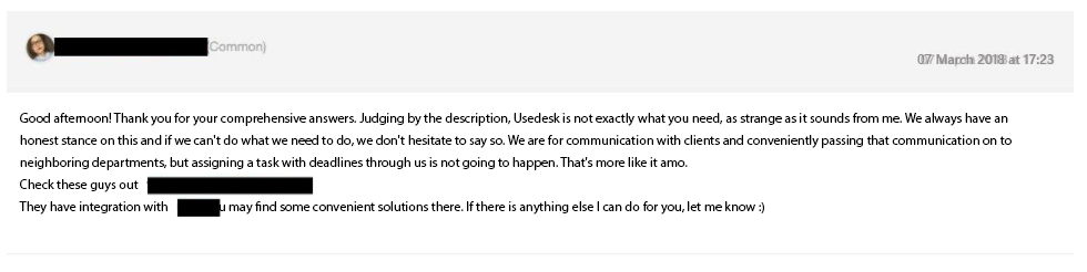 It often takes a long time to understand a task in depth. Sometimes you have to talk to the customer for 20 minutes to figure out these three things: Why? How about this? Would this solve the problem? The helpdesk doesn't have that much time. If you come across a problem that cannot be solved quickly, the operator passes it on to our Customer Success specialist. He contacts the customer separately and finds out what tasks he wants to solve.