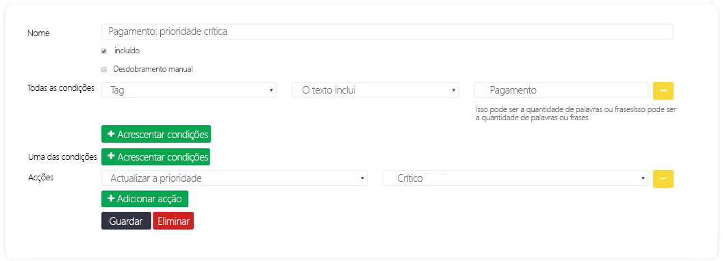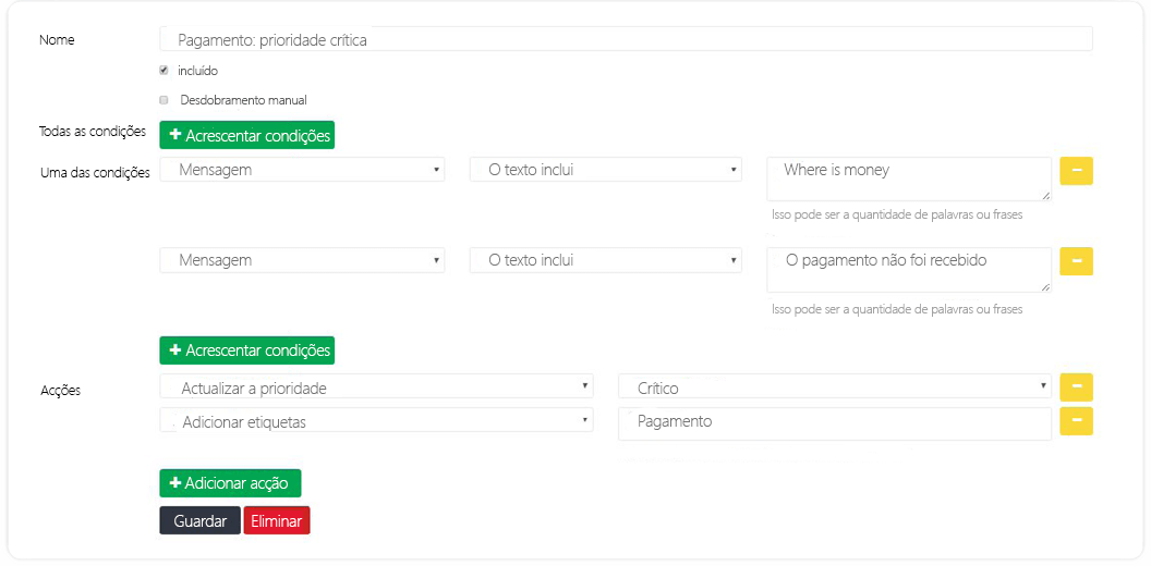 Então vamos configurar as regras. Há diversas opções: por exemplo, determinando a categoria da solicitação por palavras chave ou adicionando a etiqueta necessária para a solicitação.