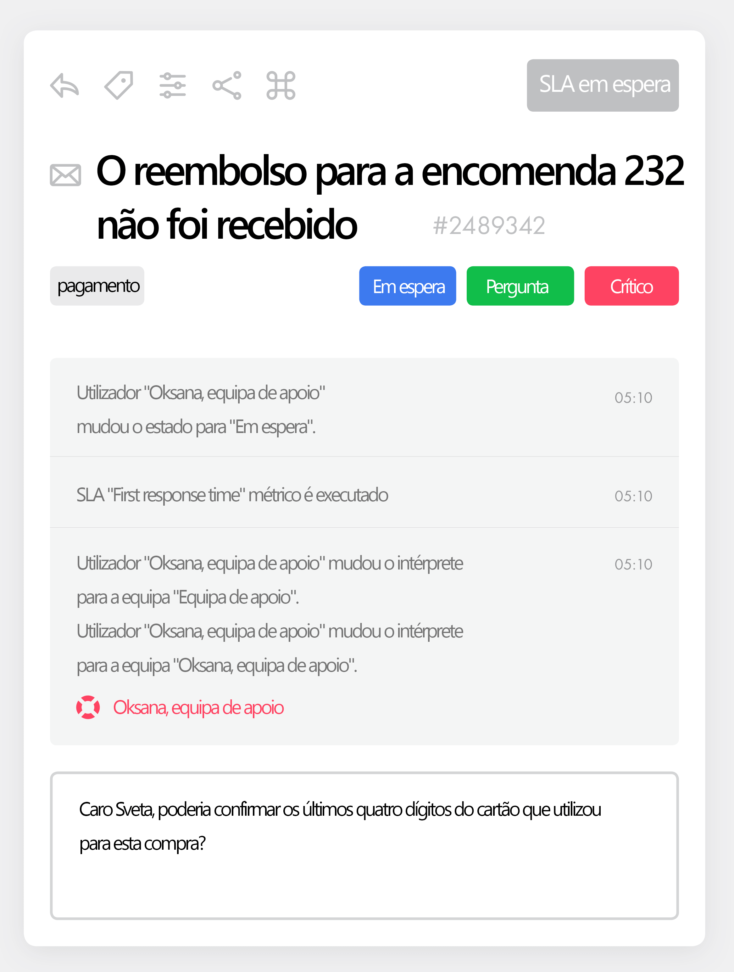 Suponhamos que um membro da equipe de suporte precisa de informação adicional do cliente para resolver o problema. Nesse caso, você pode usar o status "Pendente" - uma solicitação nesse status tem toda a medição do SLA suspenso, e no caso de reabertura pelo cliente ela é recalculada - a partir do último comentário do cliente.
